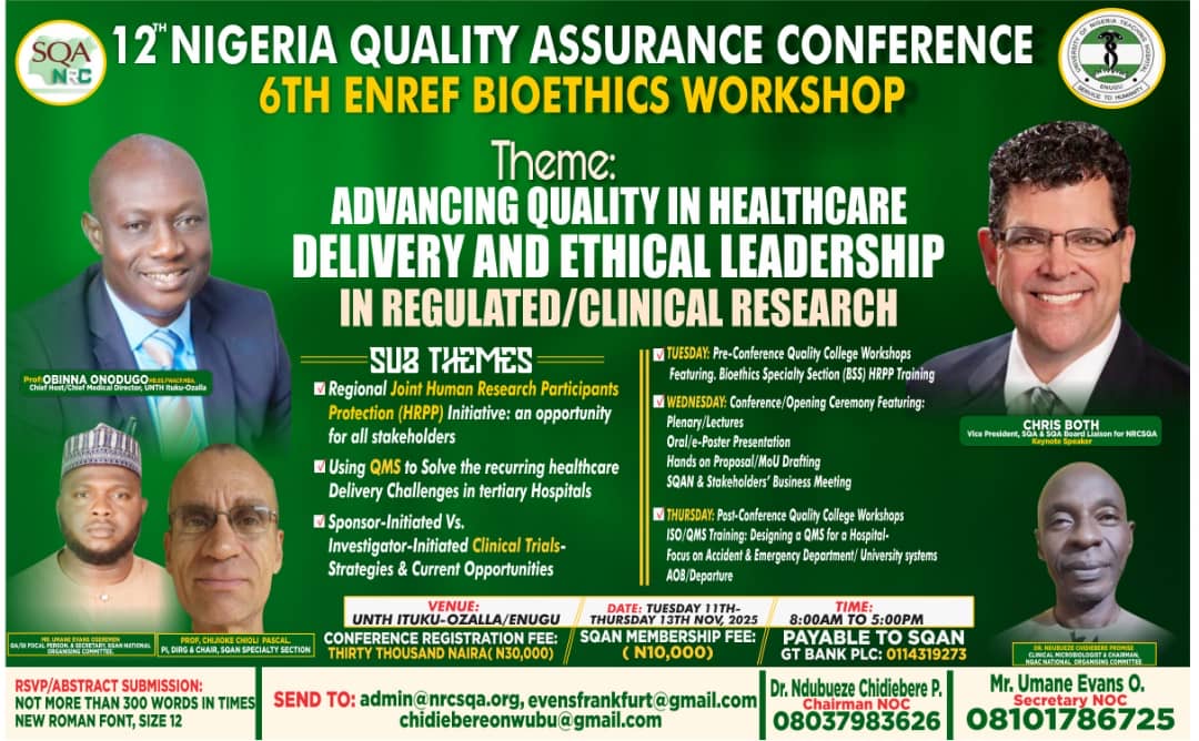 12th Nigeria Quality Assurance Conference (NQAC) & 6th ENREF Bioethics Workshop 11-13 November 2025 View the flyer for the 12th NQAC below. View additional event information on the Events Page. Presentation at 7th GQAC and 39th SQA Annual Meeting View PDF Presentation made during the 7th Global Quality Assurance Conference and the 39th SQA Annual Meeting in March 2023. Feel free to navigate this site by using any of the links on the left and right menu. See the About Us page for the current Executive Council.